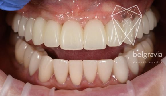 И вот сегодня, мы делимся почти финальным этапом — установлены временный протез длительного ношения на 8 имплантатах на верхней челюсти. И коронки на нижней челюсти на свои зубы и на имплантаты.