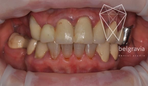 Первое обращение пациента в нашу клинику было 10 лет назад. Сложные проблемы, которые мы шаг за шагом решали, исходя из возможностей пациента. На верхней челюсти удалены полностью все зубы. Они были покрыты старыми коронками, но коронки потеряли герметичность и в корневые каналы проникла инфекция. Процесс развивался и возникли большие очаги воспаления у корней зубов. В данном случае уже невозможно было спасти зубы.