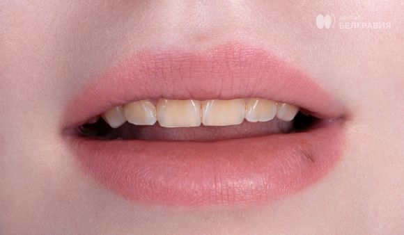 Наша пациентка — молодая девушка. Здоровые и красивые по форме зубы, но цвет эмали желтый. Такие эстетические недостатки мы исправляем с помощью керамических тонкостенных виниров (на фото видно, насколько они тонкие).